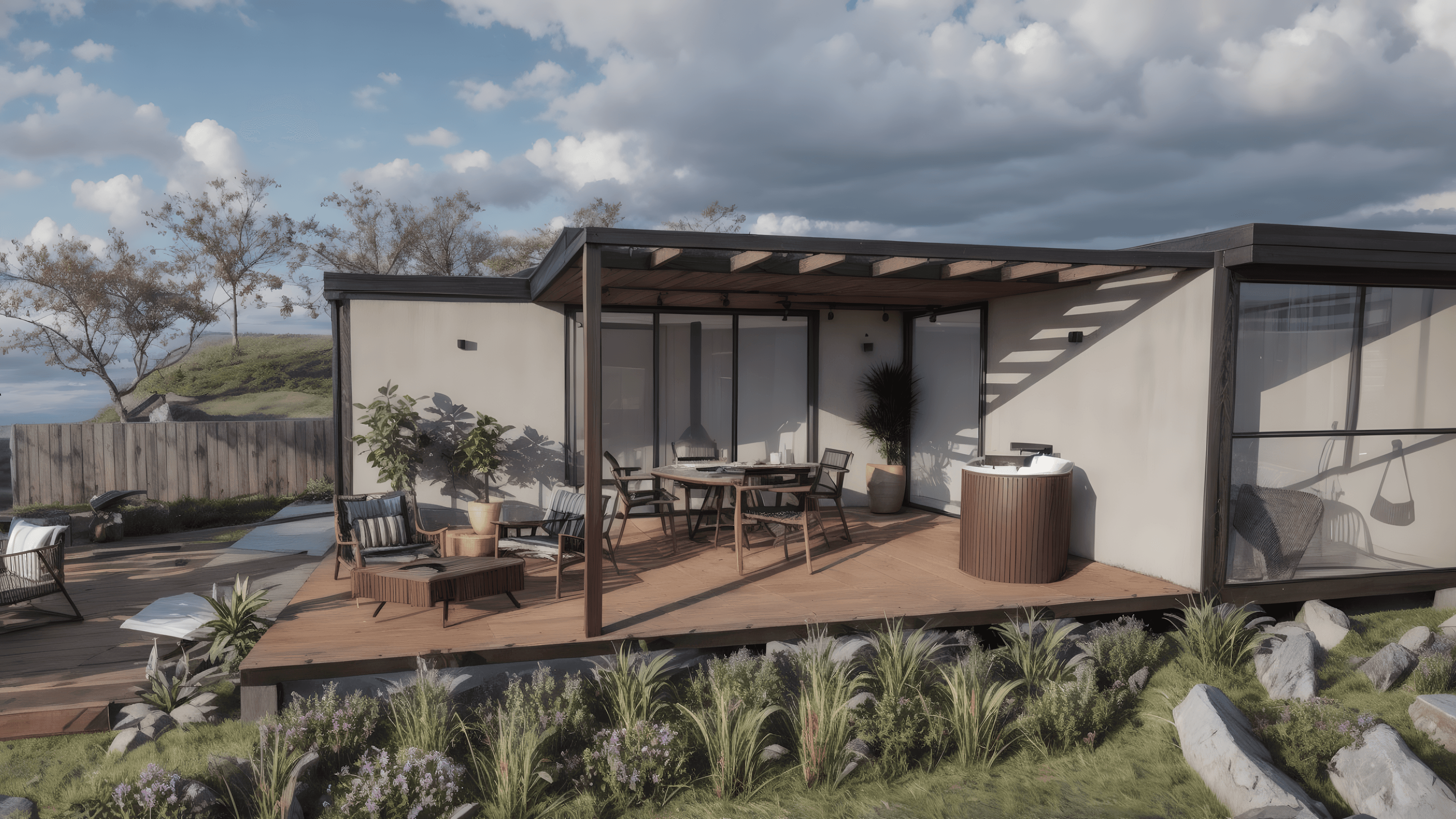 Cabana modular de 42m² para até 4 pessoas, com opção de deck e ofurô, ideal para lazer ou investimento.