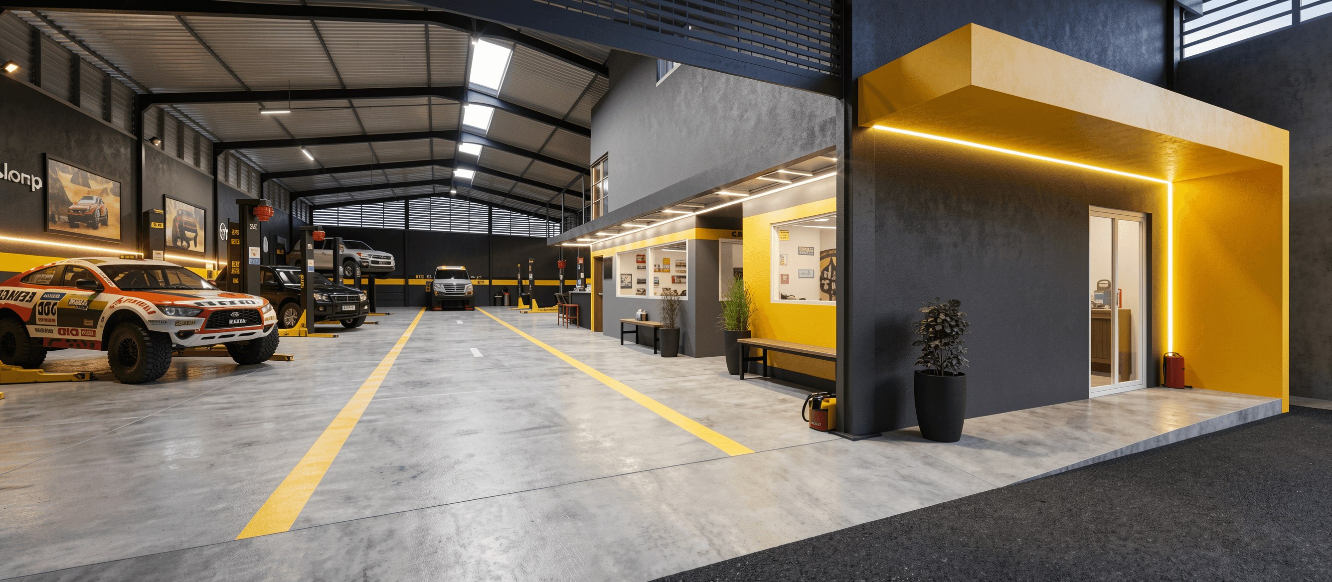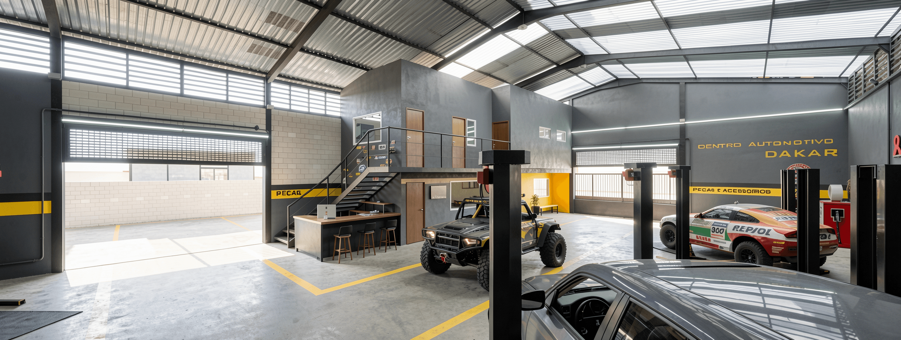 O projeto Dakar Automotive Center foi concebido para valorizar a individualidade de cada ambiente, proporcionando uma experiência completa ao cliente. A proposta organiza os espaços de forma estratégica, garantindo conforto na sala de espera e circulação segura para veículos, com fluxos bem definidos e funcionais.